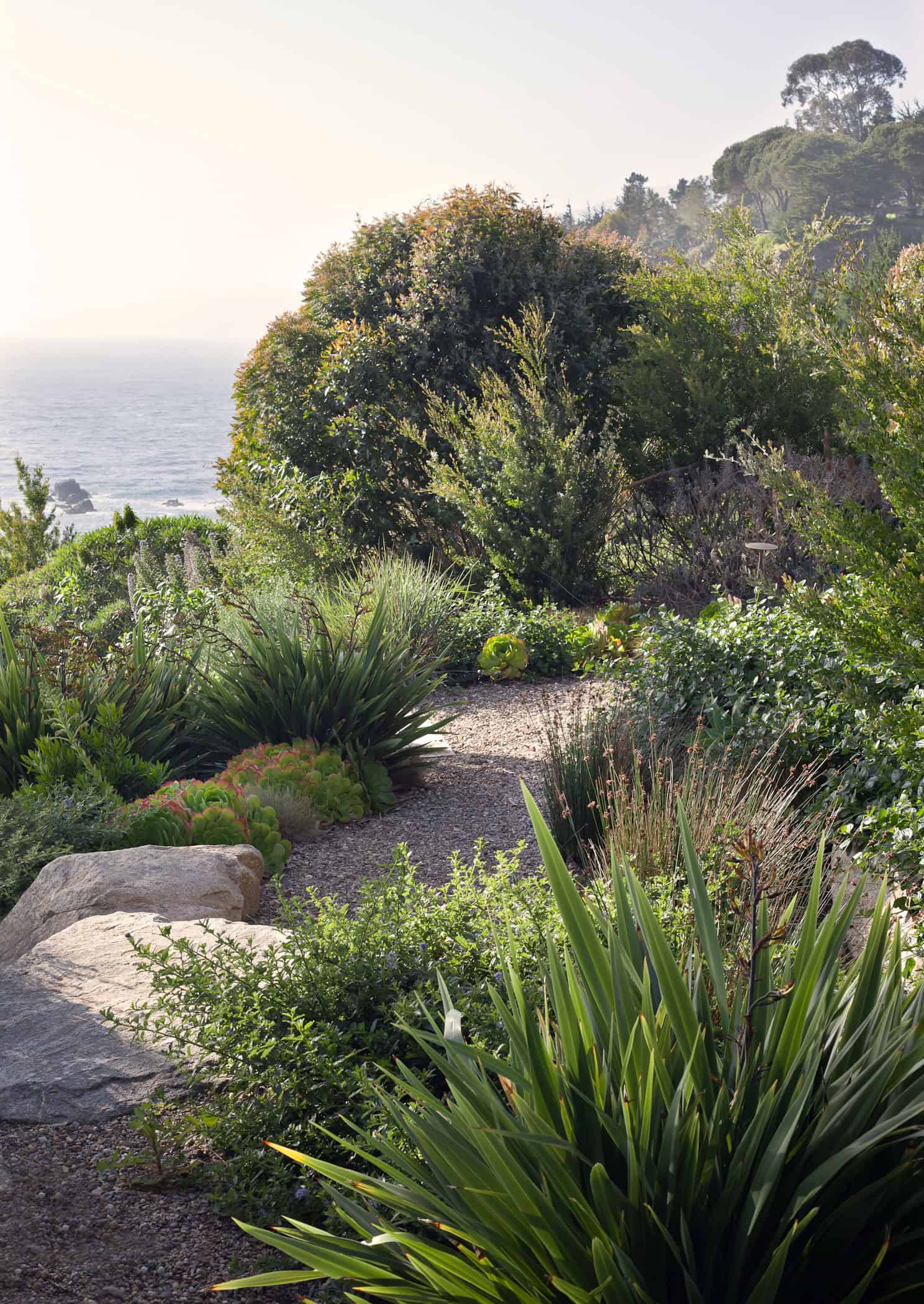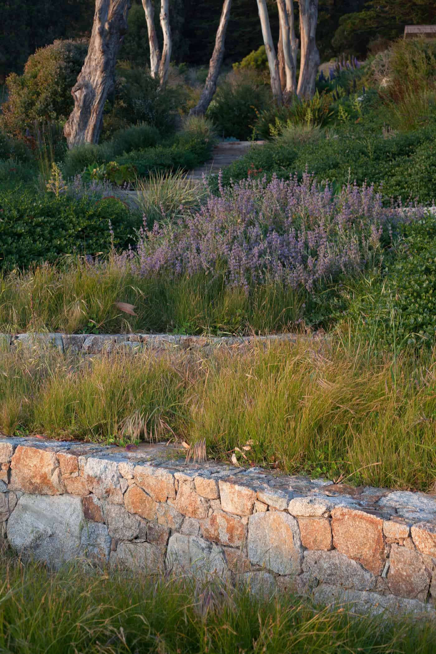 The design unfolds as a series of terraces, meandering paths, and stone seat walls—each element shaped by the client’s desire for informal gathering spaces and destinations to celebrate the views. Built forms draw from nature, with sinuous, overlapping walls that echo the tidal rhythms of the ocean below. Paving, composed of a mosaic of granite, finds its inspiration in the textures carved by coastal erosion and deposition along the shoreline. Traditional garden features such as fountains, an outdoor shower, and a solid stone fire pit are reimagined to reflect the rugged vernacular of the Big Sur coast.