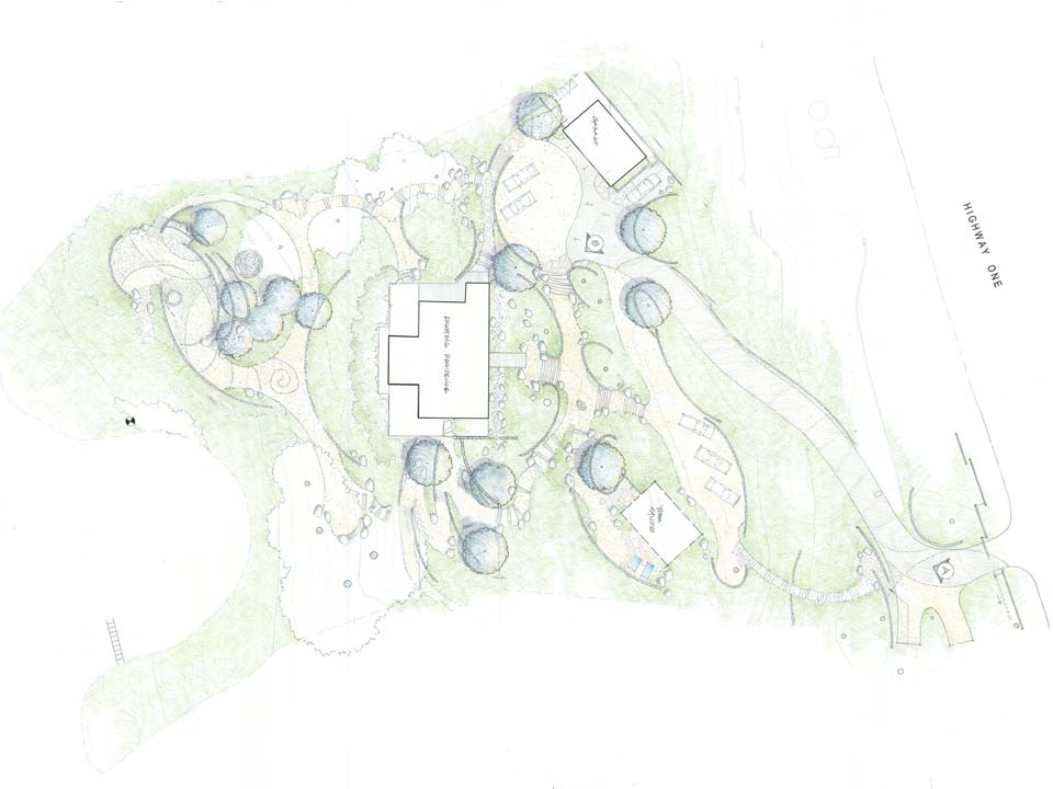 Envisioned as a private retreat, the project strikes a balance between functional outdoor living and a deep reverence for the natural aesthetics of the site. A palette of reclaimed timber, locally quarried granite and gravel, and a climate-appropriate plant palette fosters a strong sense of regional harmony with the surrounding Big Sur landscape.