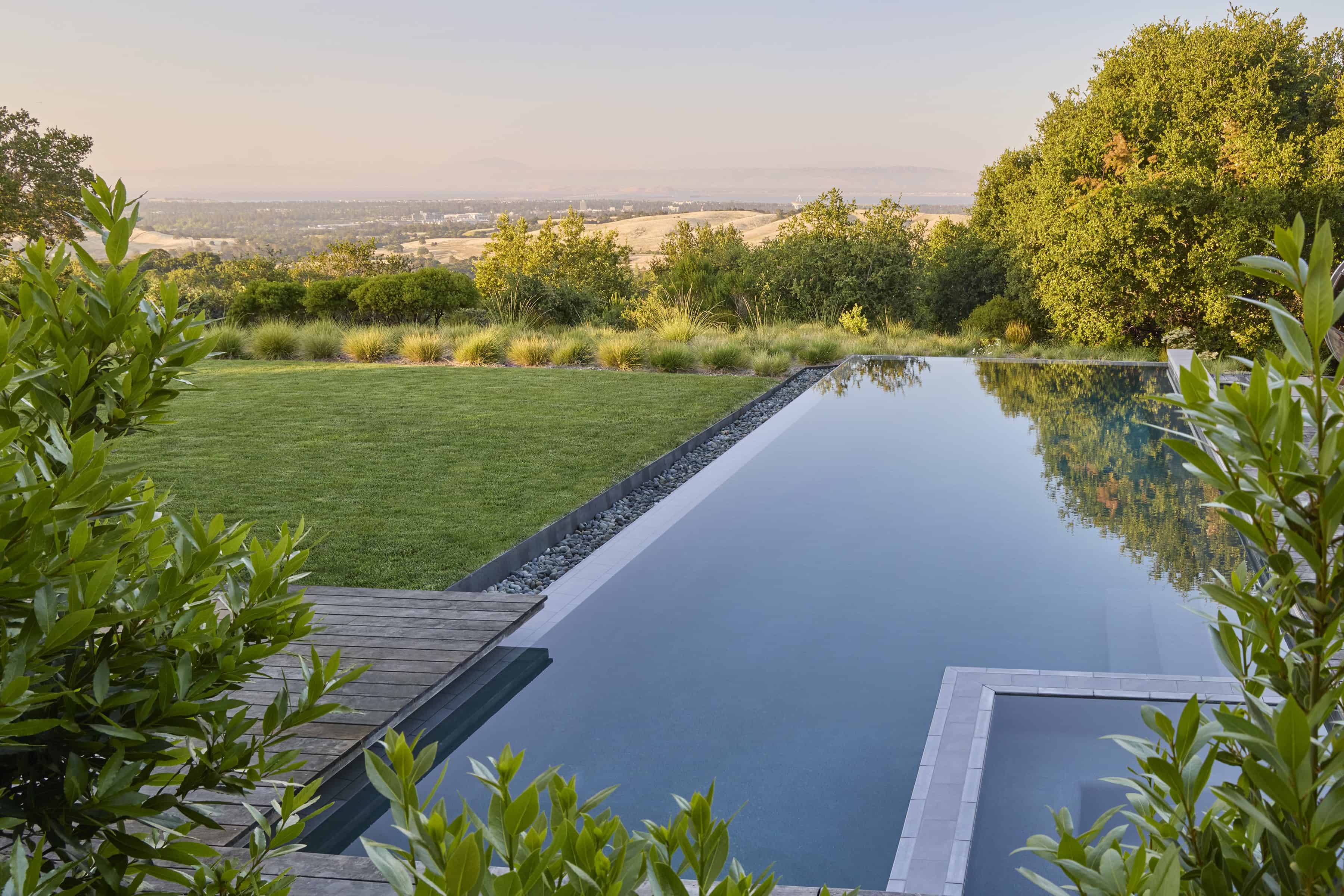 Perched atop an oak studded knoll in Portola Valley, this home and landscape were renovated in collaboration with Feldman Architects. Originally designed by Swatt Miers Architects, this modern home of concrete and glass was purchased by a young family with a keen interest in celebrating the refined + bold design sensibilities of the original architecture. With the addition of an ADU and infinity edge lap pool, the landscape design takes cues from the blurred definition of indoor and outdoor space as well as the strong geometries inherent to the architecture.