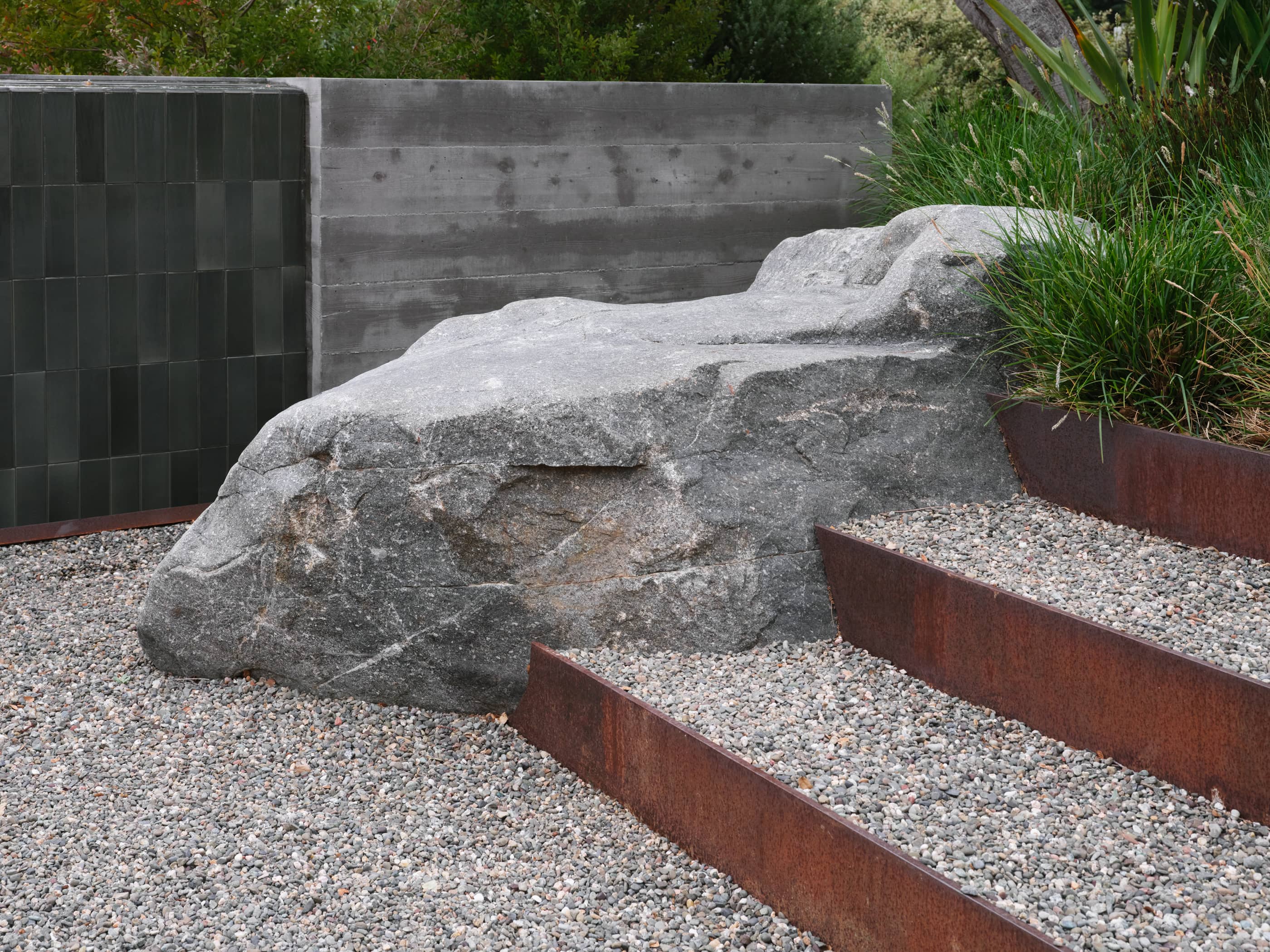 Bedrooms are connected to intimate walled courtyards for relaxing in a spa and enjoying the oak canopy above. Nearby, a wooden view terrace provides front row seating for professional golf tournaments and the serene beauty of Stillwater Cove. Core to the project is a central courtyard that connects the main residence to the guest house, encouraging entertaining, dining, outdoor cooking and gathering near the warmth of a fire pit and calming rhythm of water cascading down a tiled waterwall. In all spaces, the magnificent native oaks were retained and new oaks planted to provide shelter and shade, as well as ensure the long term benefit of this native habitat.