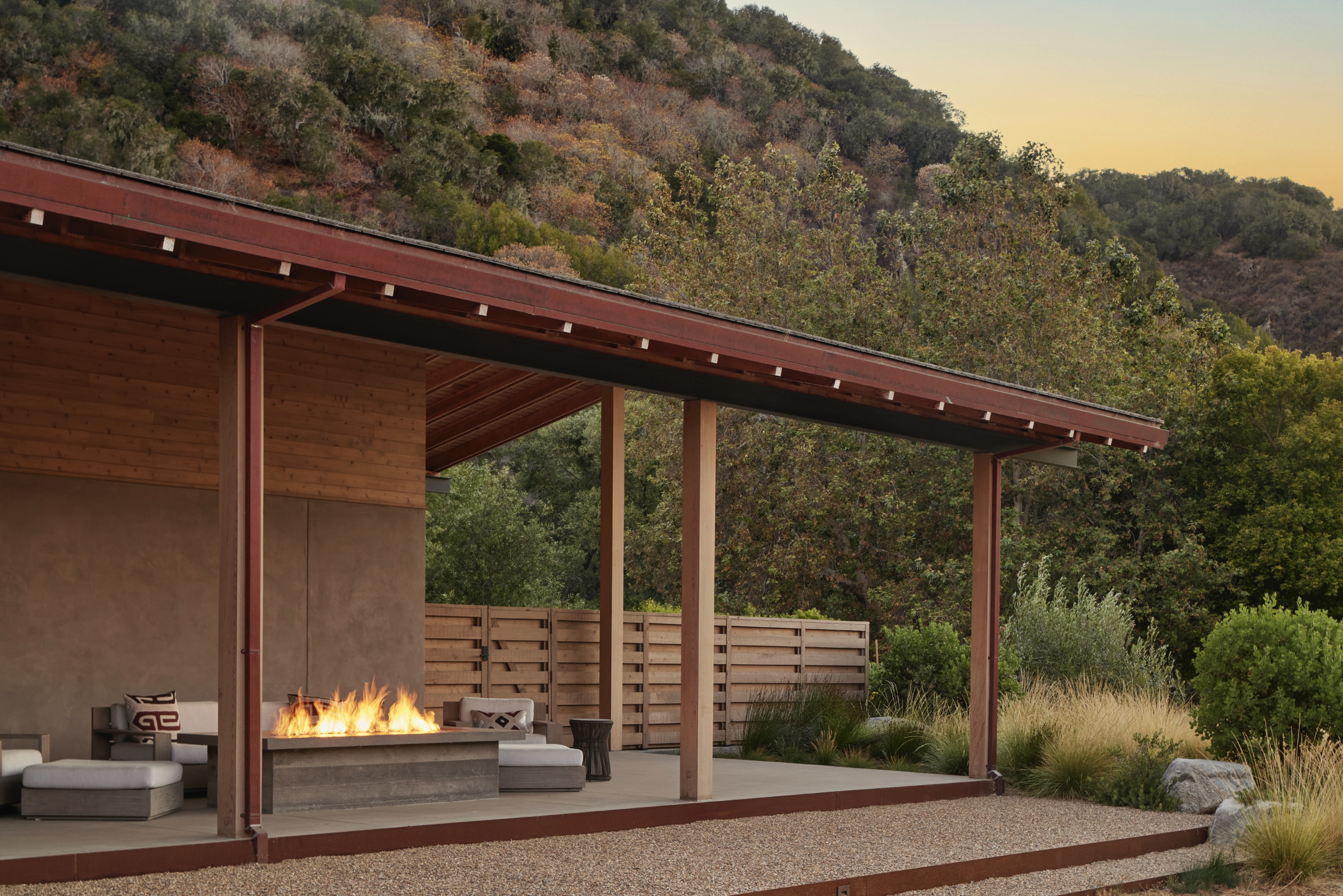 Timeless and serene, this expansive ranch property along the banks of the Carmel River seamlessly connects to the surrounding landscape and adjacent vineyard through open views, uncluttered spaces, and a regionally appropriate material palette of concrete, gravel, and stone. Sweeps of drought-tolerant native grasses reflect the golden hills beyond, while broad swaths of lavender and native groundcovers introduce subtle moments of contrasting color and texture. The landscape is open and simplistically mesmerizing, wild yet purposeful, offering a sense of spaciousness that is both comfortable and deeply liveable.
